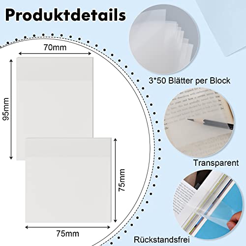 Contenuto della confezione: 150 fogli (3 blocchi) di foglietti adesivi trasparenti, dimensioni: 50 pezzi 7,5 x 7,5 cm + 100 pezzi 9,5 x 7 cm, peso: 76 g