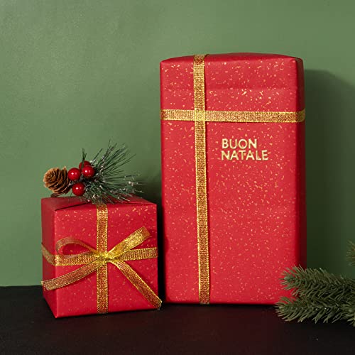 【Il pacchetto include:】3 fogli di carta da regalo rossa, 2 pagine di adesivi lettere alfabeto numero dorato ed 1 rotolo di nastro dorato.