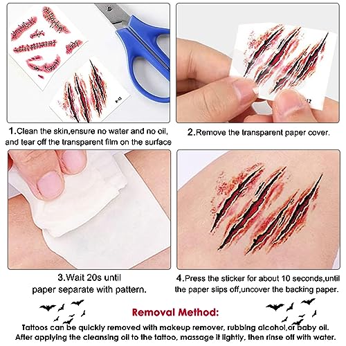 【Materiale Aicuro】 I tatuaggi con cicatrici di Halloween sono realizzati con materiali ecologici, sicuri e non tossici e possono essere utilizzati da adulti e bambini.