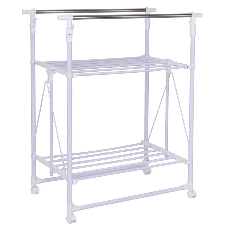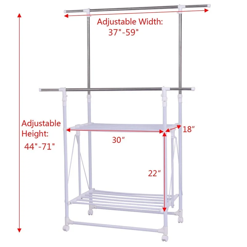 Folding Adjustable Rolling Clothes Coat Rack Hanger with 2 Shelves Living Room Furniture HW55984