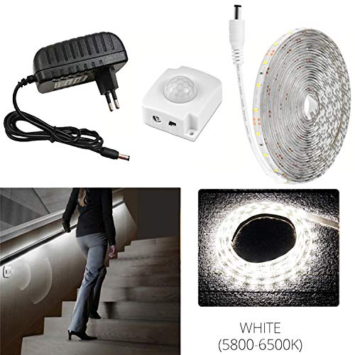 FOLGEMIR 3m Luce notturna a LED - bianco freddo, strisce LED con sensore di movimento PIR, set completo con trasformatore DC 12V, IP65 impermeabile per letti bambini, mobili da corridoio, cucina