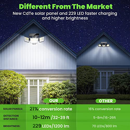 ☪☪Luce Solare Super Luminosa con Rilevatore di Movimento: Lampada da parete con 229 LED, angolo di illuminazione di 270°, 3 teste luminose rotanti per ottenere una buona distribuzione della luce. 1200LM ad alta luminosità, può illuminare la strada verso la casa. Il sensore di movimento rileva un angolo di 120° e può rilevare persone in movimento a una distanza di 10-12 metri, reagendo immediatamente al movimento.