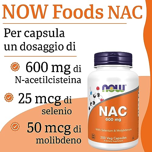 AD ALTO DOSAGGIO: Una dose, una capsula ogni tre giorni, NAC 600mg di Now Foods contiene 600mg di NAC, 50mcg di molibdeno e 25mcg di selenio che puoi dare al tuo corpo ogni giorno