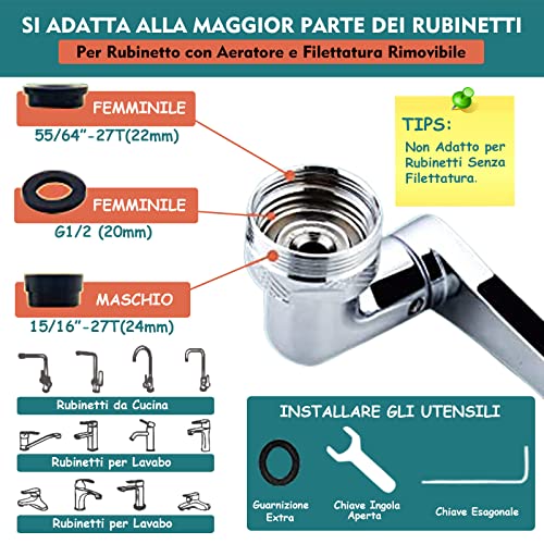 【INSTALLAZIONE SEMPLICE】L'installazione della estensione rubinetto è semplice: utilizzare la chiave a becco singolo per rimuovere l'aeratore originale,scegliere la guarnizione appropriata e serrare il nuovo estensore.La tenuta dei giunti può essere regolata con la chiave esagonale. La parte di connessione dell'estensore ha un design multi-adattatore, che fornisce tre diverse dimensioni per adattarsi alla maggior parte dei rubinetti: Femmina 22 mm, Femmina G1/2 20 mm e Maschio 24 mm.