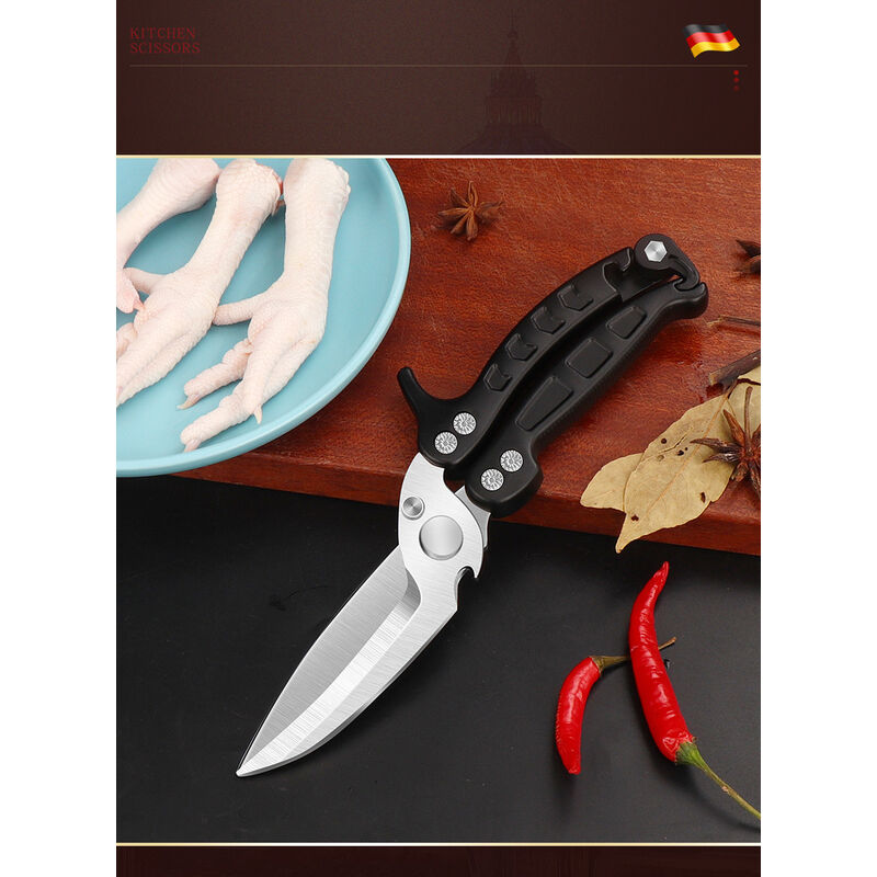 I manici ergonomici a lisca di pesce delle forbici da cucina in acciaio inossidabile sono realizzati in ottone di prima qualità, che li rende comodi e antiscivolo. E il manico delle forbici per pollo da cucina con presa eccellente è adatto sia per utenti mancini che destrimani. Il design ergonomico a lisca di pesce darà alla tua mano una presa più comoda durante il taglio degli ingredienti alimentari. Le forbici per pollame da cucina sono realizzate in acciaio inossidabile di qualità, che le rende più affilate e più spesse. La lama delle forbici professionali per pollame è estremamente affilata e una delle lame a bordo seghettato è uno strumento ideale per raschiare le squame di pesce. È facile per le forbici da cucina tagliare ali di pollo, pesce, carne e verdure, rendendolo un ruolo essenziale in cucina. Non c'è bisogno di preoccuparsi della ruggine delle forbici da cucina: le forbici da cucina professionali in acciaio inossidabile sono facili per igienizzare e pulire. Si prega di