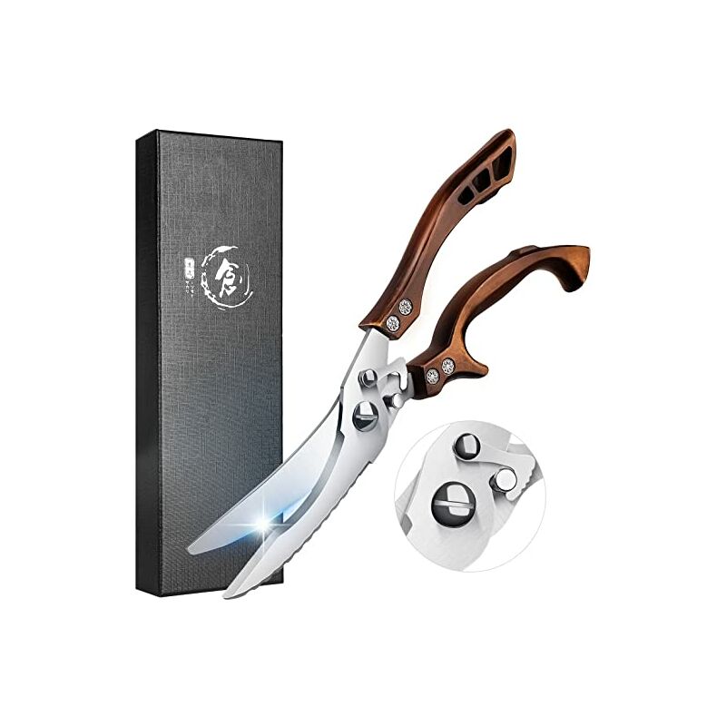 FORBICI PER POLLAME ULTRA AFFILATE DI QUALITÀ PREMIUM - Le forbici per pollame da cucina di alta qualità forgiate in acciaio inossidabile di alta qualità sono più affilate e più spesse. La lama delle forbici per carne da cucina è estremamente affilata e una delle lame con bordo seghettato è adatta per raschiare le squame di pesce. È facile per le forbici per pollo da cucina affettare pollame, ali di tacchino, pesce e tagliare gli ingredienti senza scivolare, rendendolo un ruolo fondamentale in cucina. le forbici da cucina in ottone di prima qualità, che le rendono antiscivolo e ti danno una presa comoda. E il manico robusto delle forbici per pollame con presa eccellente è adatto sia per utenti mancini che destrorsi. Il design ad arco di cavalluccio marino proteggerà la tua mano dalle lesioni durante il taglio degli ingredienti alimentari. Inoltre rivetti rinforzati incorporati in profondità nel manico che lo rendono forte e solido. alleviare la pressione della tua mano. La molla di