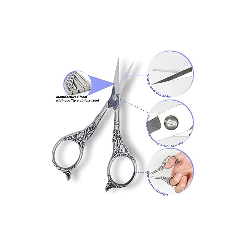Le forbici sono ben realizzate in acciaio inossidabile, trattato per affilatura e resistenza all'abrasione di lunga durata. Il manico in acciaio inossidabile di alta qualità è comodo da impugnare e facile da usare. Progettato con un bellissimo motivo floreale sul manico, pregevole fattura. Le forbici sono molto affilate, non sono solo uno strumento ma anche un'ottima decorazione. Ottimo regalo per gli amici che amano le forbici, il cucito o il fai-da-te. Può essere ampiamente utilizzato per cucire, scrapbooking, artigianato, ricamo, sartoria, crewing, artigianato, ecc. Promemoria caldo -> NON per tagliare fili pesanti o tessuti duri, solo per fili, il filo taglia il lembo della busta. Tienilo fuori dalla portata dei bambini in caso di forte colpo.