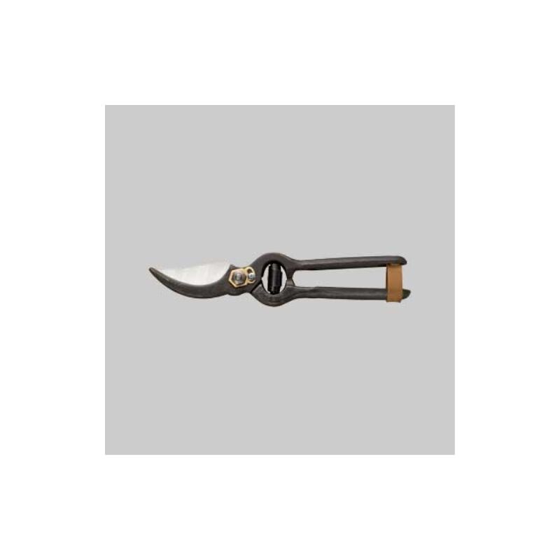 In acciaio forgiato a caldo e temprato. Chiusura con laccetto in cuoio. Finitura brunita. Forbici da vigna due buoi 23 cm DUE BUOI Forbici e accessori