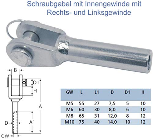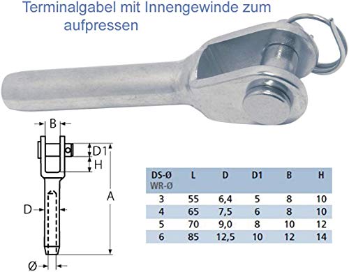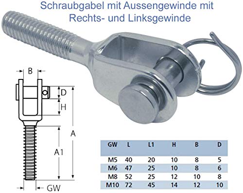 Forcella a vite - Terminale forcella per funi metalliche - acciaio inox A4 - AISI316 (forcella con filettatura esterna, filettatura destra per fune metallica di diametro M 10)