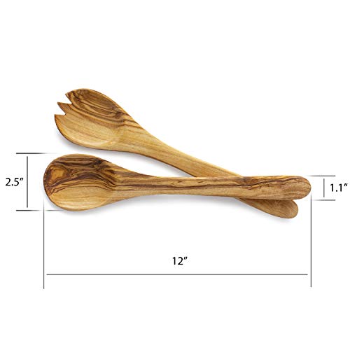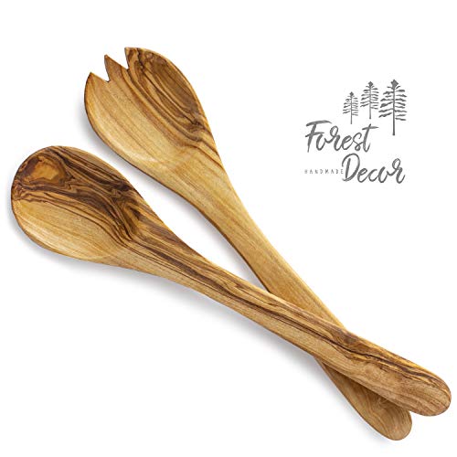 Forest Decor - Set di posate per insalata, forchetta e cucchiaio, posate per insalata, per preparare, lanciare e servire cibo, in legno di ulivo naturale, utensili da cucina in legno artigianale