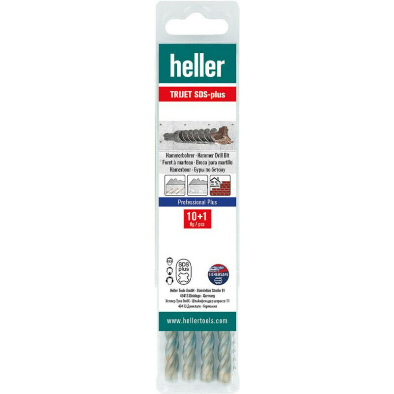 SDS-plus set di punte per martello Trijet Multipack 10+1 - Tagliente della ruota a lama con 3 lame per una maggiore efficacia nell'asportazione del materiale - Maggiore trasmissione di potenza durante la foratura grazie al design della testa a forma di onda - La testa in carburo incassata resiste ai colpi di rinforzo - Lega di carburo monofase . lega di carburo di fase - Rapida rimozione della polvere di perforazione senza deflagrazione grazie all'ampia forma dell'elica - Tripla elica ottimizzata per le vibrazioni - Processo di tempra DuraTec con tecnologia di brasatura ad alta temperatura e granigliatura - Per calcestruzzo delle qualità più dure. cemento armato. pietra naturale. muratura. Clinker Consegna: in scatola di plastica.