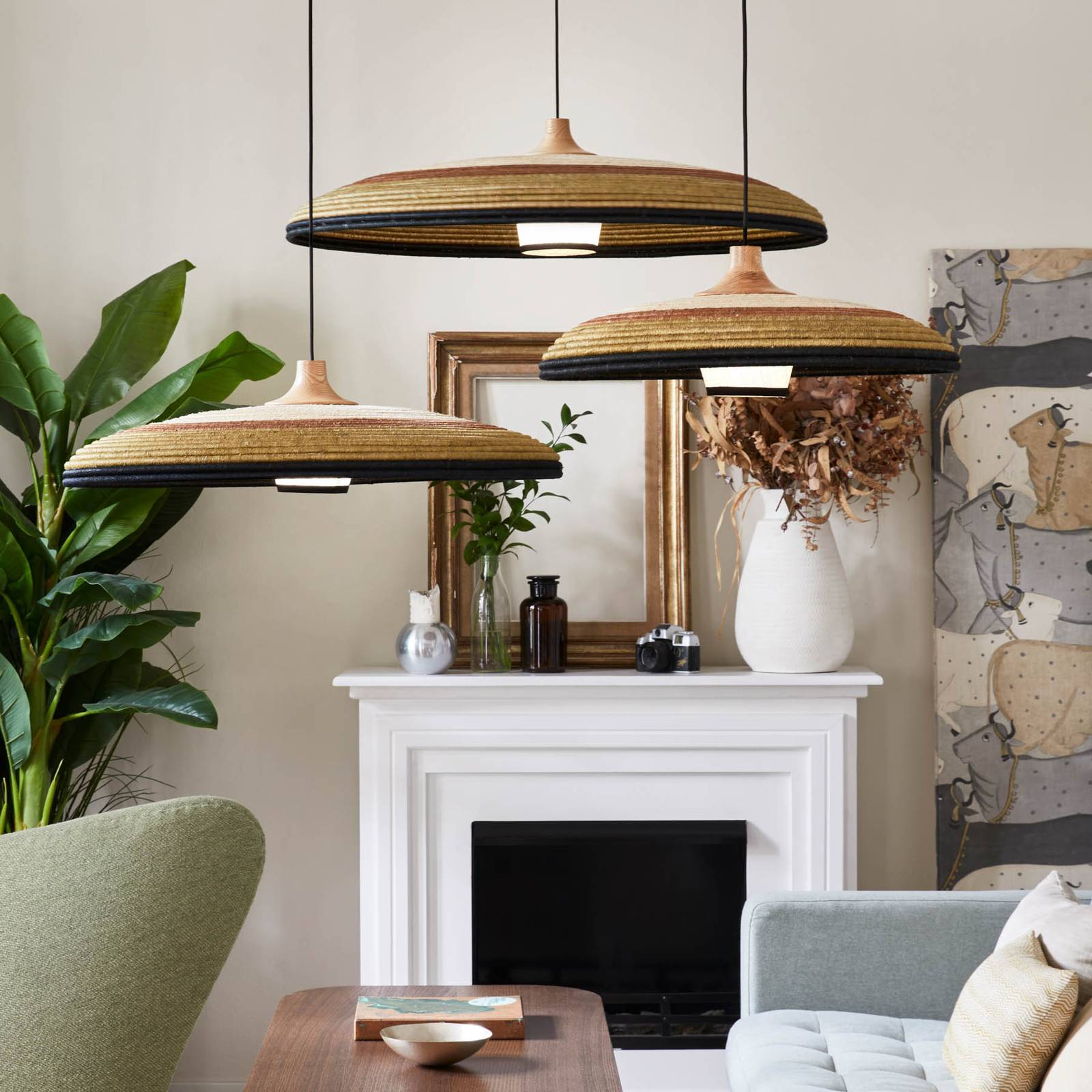 Lampada a sospensione espansiva Grass L con paralume fatto a mano con materiali naturali La lampada a sospensione Grass L cattura l'attenzione con il suo paralume sporgente e arrotondato e può essere utilizzata meravigliosamente per illuminare il tavolo del soggiorno o della sala da pranzo. La tonalità è composta da strisce sovrapposte, che sono disegnate in diversi colori caldi. È fatto di rattan e abacá, una specie di pianta dell'Asia orientale che viene usata, per esempio, per la produzione di corde per navi. La lampada a sospensione porta un tocco attraente e naturale alla zona giorno e crea un'atmosfera accogliente. Il portalampada è posto al centro dell'interno del paralume. Questo è circondato da un diffusore separato e assicura che la luce venga emessa senza abbagliare l'ambiente circostante. Con la serie di lampade Grass, la product designer Jette Scheib ha voluto esprimere la tranquillità che si trova nel processo di tessitura t