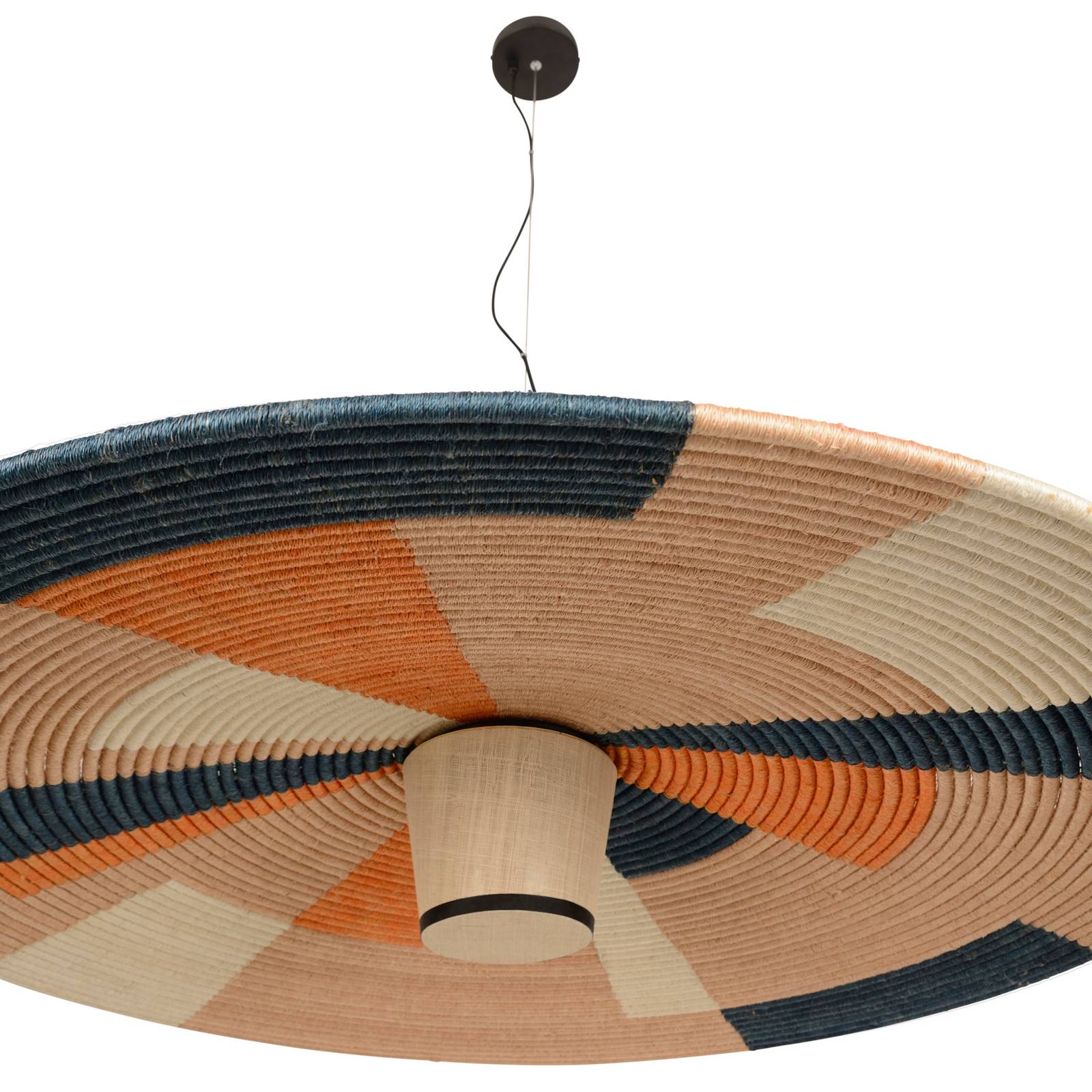 Lampada a sospensione artigianale Parrot XXL con paralume espansivo in rattan e abacá La lampada a sospensione Parrot XXL cattura l'attenzione con il suo paralume particolarmente grande fatto di rattan e abacá, una pianta originaria dell'Asia orientale. Si compone di piccole corde sovrapposte, che sono state disegnate in diversi colori e creano così un modello insolito. La sospensione in tessuto e il baldacchino in metallo sono progettati in nero e completano il look della lampada a sospensione. All'interno, il portalampada è circondato da un diffusore separato, per cui la luce viene emessa senza abbagliare l'ambiente circostante. Con un dimmer esterno e una lampadina adatta, è possibile attenuare la luce. Nel progettare la serie di lampade Parrot, la product designer Jette Scheib si è ispirata all'influenza culturale e alla diversità della tessitura e del design dei cesti. La collezione sottolinea il lato colorato ed espressivo della
