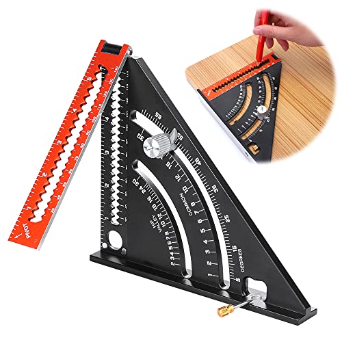 [9 in 1 Triangolo Squadra da Carpentiere Goniometro Quadrato] - Squadra da Falegname in Allumino ha molteplici funzioni, distanza di misurazione estesa / misurazione dellangolo / angolo uguale / linea orizzontale / linea verticale / linea ondulata / strumento per disegnare linee nascoste / cm/ Zoll due unità di misura/finitura foro appendiabito. Nove funzioni per tutti i progetti di costruzione e riqualificazione.