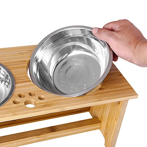 FOREYY Ciotole per Cani alzate per Cani e Gatti Ciotole per Cibo e Ciotole per Cani in bambù Elevated Stands Piatti per mangiatoie con 2 Ciotole in Acciaio Inox e Piedini Antiscivolo (M)