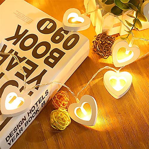 10 LED a forma di cuore in legno bianco caldo con filo faggio, luce per il periodo di Natale, illuminazione per feste, alimentata a batteria (10 LED).