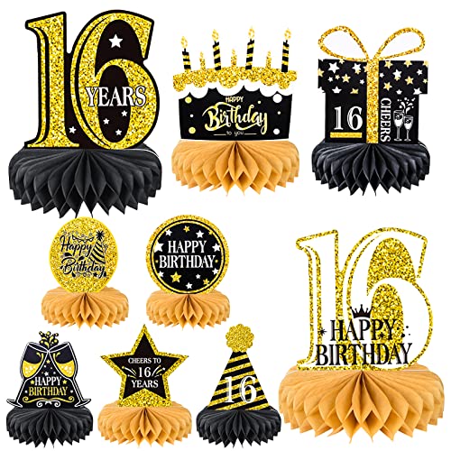 FORMIZON Centrotavola 16° Compleanno, 9 Pezzi 16 Anni Centrotavola a Nido d'Ape, Oro Nero Centrotavola a Nido d'Ape, Decorazione per 16° Compleanno Toppers Tavolo, Feste di Compleanni, Uomini, Donne