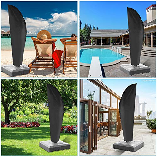 Resistente al vento - Questa copertura protettiva per ombrellone è facile da indossare e da togliere con la zip. Il fondo rotondo con coulisse con cordino blocca saldamente il coperchio e impedisce al vento di soffiarlo dall'ombrello. La cover viene inoltre fornito con una cerniera tasca portaoggetti per una facile memorizzazione e portabilità.