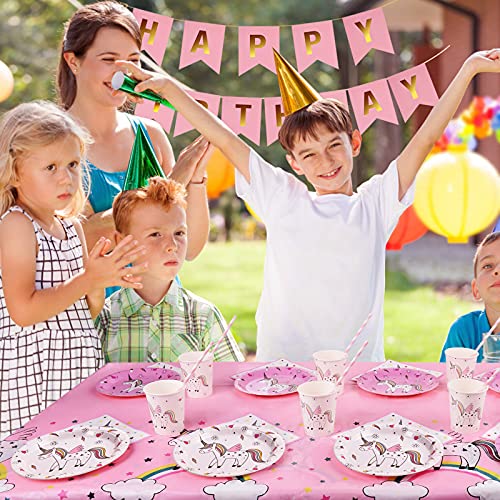 [Soddisfa Perfettamente Le Tue Esigenze]: Questo set per unicorno include piatti grandi, piatti piccoli, cannucce, tovaglie, tovaglioli, striscioni e tazze. Oltre alle cannucce, che sono rosa e bianche, gli altri piatti sono stampati con unicorni dei cartoni animati.