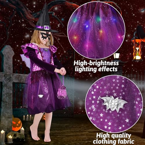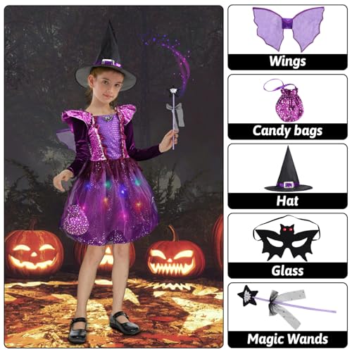 ♀️【Set di Costumi da Strega Bambina】Costume da strega viola nero che include abito luminoso, ali, cappello, sacchetto di caramelle, bacchetta, maschera per gli occhi. Indossate questo costume da strega e la vostra bambina sarà la strega magica più accattivante della festa!