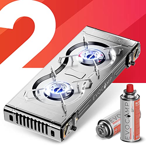 TUTTOFARE: con il fornello a gas portatile con cartuccia a 2 fiamme è possibile preparare tutti i tipi di piatti. Il fornello da campeggio a gas è ideale per cucinare ovunque all'aperto, aree barbecue, aree di servizio autostradali, terrazze, balconi o in giardino.