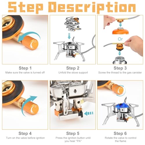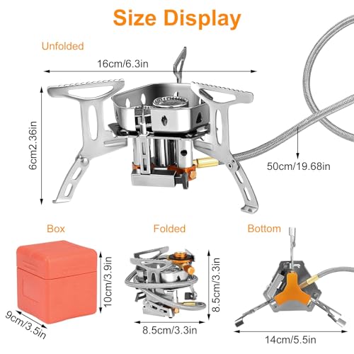 【Forte compatibilità】: resistente stufa da picnic in lega di alluminio e acciaio inossidabile, dotata di sistema di accensione piezoelettrica e regolatore della fiamma, lo rendono più comodo e praticabile. Dotato di 2 tipi di connettore, perfetto per diversi serbatoi di gas. Compatibile con qualsiasi serbatoio di combustibile misto butano a 7/16 filetti singolo butano/butano-propano (EN 417).