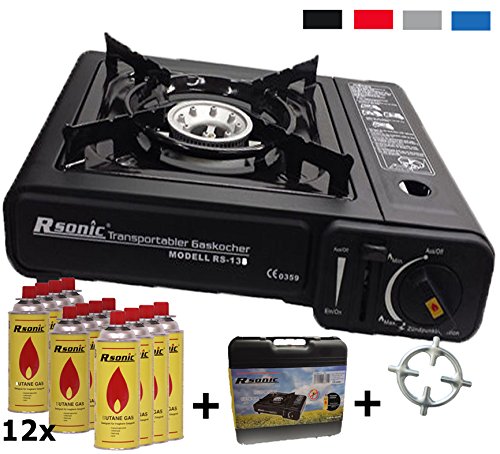Fornello a gas fornello da campeggio + 12 x cartucce gas croce + Gas + Valigetta (colore Nero, Rosso, Blu o grigio)
