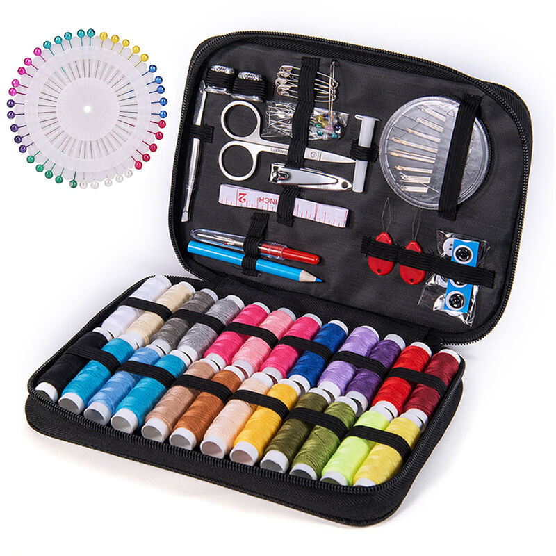 Ditale, 1 tagliafilo, 2 fora ago, 1 tagliaunghie, 3 bottoni nascosti, 1 pennarello (colore casuale), 1 taglia asole, 5 spilli, 50 aghi perlescenti, 1 scatola e amp ;