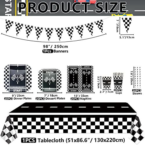 Dimensioni perfette: il piatto piano è di 23 cm, il piatto da dessert è di 18 cm, la tovaglia da pista è di 130 x 220 cm, la cannuccia di carta è di 18 cm, la tazza è di 250 ml, il tovagliolo da tavola è di 17 cm x 17 cm e la bandiera bianca a scacchi è di 13 x 18 cm, lunghezza 250 cm.