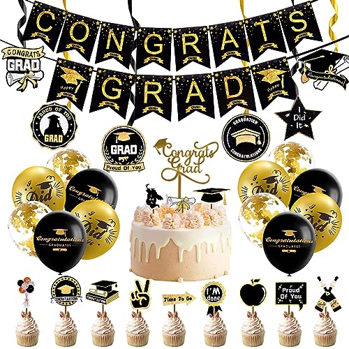 Forniture per Feste di Laurea,Laurea Accessori 34 Pezzi,Decorazioni Torta Laurea Cupcake Topper Decorazioni di Laurea Nere e Dorate Congratulazioni Banner di Laurea, Tenda in Lamina per Decorazioni