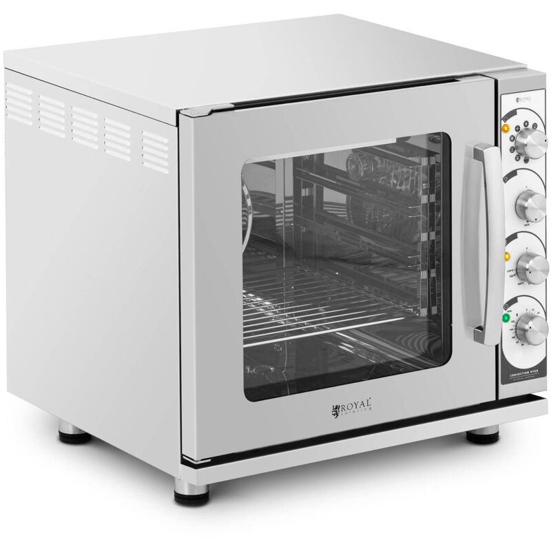 Forno a convezione RC-EO423MS di Royal Catering _x000D_ L'elemento riscaldante lavora con 3.000 Watt di potenza, mentre un sistema di circolazione dell'aria calda permette una cottura veloce. La convezione consente di cucinare cibi diversi contemporaneamente senza dover girare o scambiare i piatti. Il forno elettrico dispone di un termostato regolabile tra 50 e 270 °C che mantiene la temperatura in modo continuato. _x000D_ Ciò mantiene il consumo di energia il più basso possibile. Il timer integrato può essere utilizzato in modo ottimale ed essere impostato tra 0 e 120 minuti. Allo scadere del tempo, il forno si spegne automaticamente. Grazie alla funzione vapore, attivabile premendo un pulsante, è possibile umidificare le pietanze durante la cottura per evitare che si asciughino troppo. _x000D_ L'alloggiamento e l'interno del forno a convezione sono realizzati in acciaio inossidabile di alta qualità che reagisce in modo neutro al contatto con gli alimenti ed è particolarmente robusto