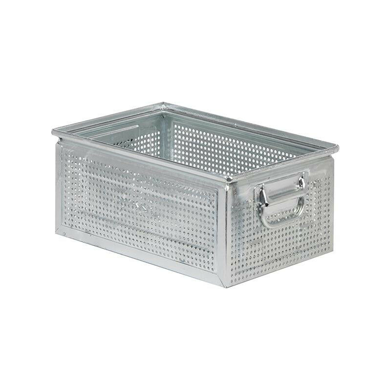 Contenitore impilabile tipo misura 272. forato - Contenitore rettangolare in metallo impilabile - Con maniglie - Pareti e fondo forati - Per sgrassare i componenti prima di un assemblaggio. per sgocciolare i liquidi di lavaggio. per la ventilazione del contenuto e anche per lo stoccaggio di materiale industriale