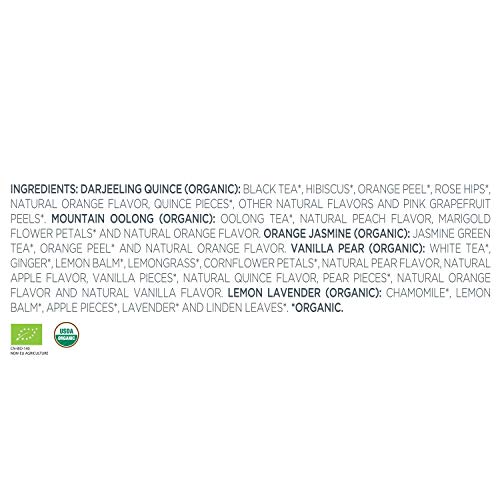20 piramidi di tè, 4 per ciascuno dei seguenti gusti: Pera alla vaniglia, Gelsomino d'arancia, Oolong di montagna, Darjeeling Quince e Lavanda al limone