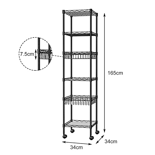 Forthcan Scaffalatura a 6 Ripiani,Scaffale a 4 ripiani 2 cestini per cucina soggiorno, risparmia spazio Antiruggine Anticorrosione Altezza regolabile Facile da montare 34x34x165