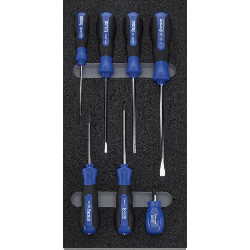 Modulo di uscita Tournevis plats pour vis à fente/PH - Plateau en mousse bicolore. permettant de voir immédiatement s'il manque un outil Contenu: 4 tournevis plats pour vis à fente 3.5. 4.5. 5.5. 6.5 mm 2 tournevis cruciformes PH 1. PH 2 1 tournevis boule cruciforme PH 2