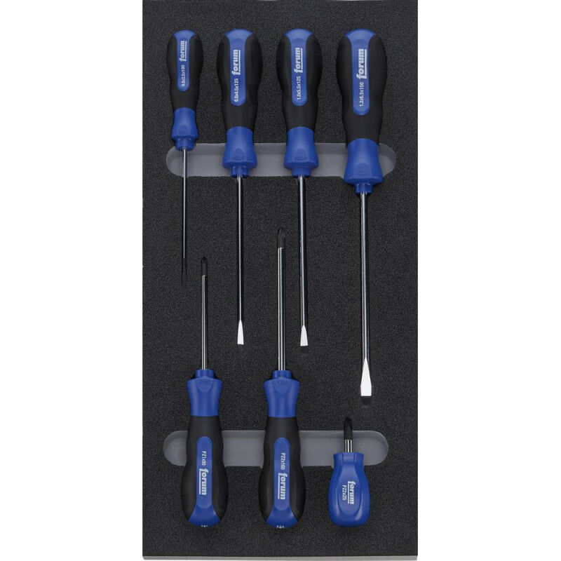 Modulo di uscita Tournevis plats pour vis à fente/PZ - Plateau en mousse bicolore. permettant de voir immédiatement s'il manque un outil Contenu: 4 tournevis plats pour vis à fente 3.5. 4.5. 5.5. 6.5 mm 2 tournevis cruciformes PZ 1. PZ 2 1 tournevis boule cruciforme PZ 2