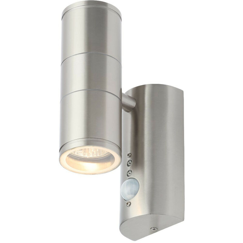 Forum Islay PIR Lampada da Parete da Esterno Up Down a 2 Luci in Acciaio Satinato IP44 | Finitura: Acciaio Satinato | Materiale: acciaio inossidabile 316 | Grado di protezione IP: IP44 | Altezza: 20,5 cm | Larghezza: 7 cm | Profondità: 12,1 cm | Tipo di lampada: GU10 | N. di lampade: 2 | Peso: 0,75 kg | Potenza (massima): 35 W