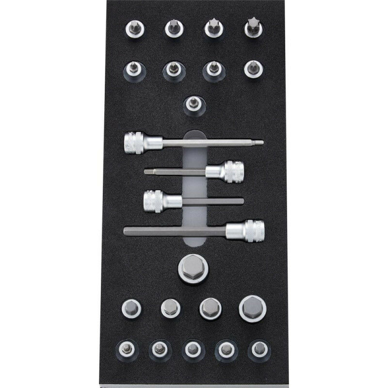Modulo d'uscita Imballaggi di visualizzazione 1/2 - Plateau in mousse bicolore. che permette di vedere immediatamente se manca un attrezzo Contenuto: 9 imballaggi di visualizzazione 6 teglie 4. 5. 6. 8. 10. 12. 14. 17. 19 mm 4 imballaggi di visualizzazione 6 teglie. lunghe 6. 7. 8. 10 mm 9 boccole di fissaggio per vis TORX® femelle T 20. T 25. T 27. T 30. T 40. T 45. T 50. T 55. T 60