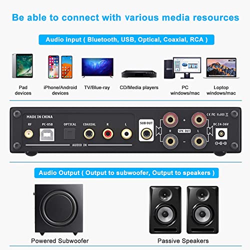 L'amplificatore Bluetooth 5.0 con aptX & aptX-HD vi permette di trasmettere musica in streaming e suono stereo in modo nitido.