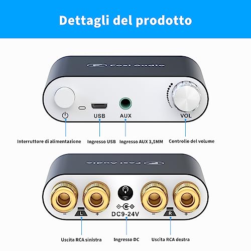 100W RMS X 2(4 ohm, 20 Hz - 20 kHz, meno dello 0,1% THD), viene fornito con alimentazione DC19V. (Solo per altoparlanti passivi, non per quelli amplificati).