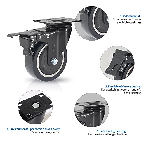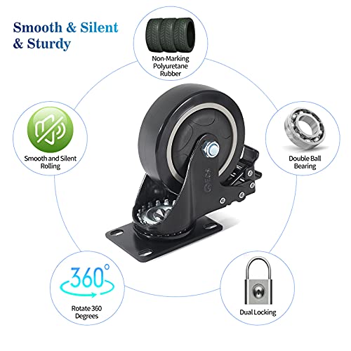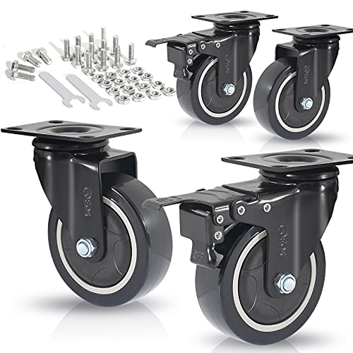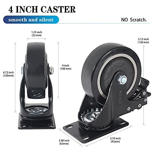 FOSLAP Heavy Duty Castor Wheels 600KG 100mm with Wrench and Bolt Screws - PU Rubber Swivel Wheels for Moving Furniture and Trolley (Black 2 Brakes 2 Non Brakes)