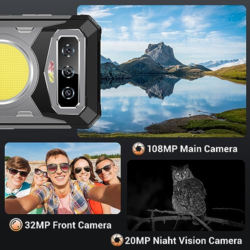 【Telecamera tripla da 108MP e fotocamera per la visione notturna da 20MP】Il telefono per esterni F102 è dotato di una fotocamera principale da 108MP e di una fotocamera per la visione notturna da 20MP. La fotocamera per la visione notturna da 20MP IR scatta foto e video monocromatici in HD in condizioni di scarsa illuminazione o di buio totale. Con la fotocamera principale da 108MP è possibile catturare splendidi paesaggi. La fotocamera frontale da 32MP vi rende sempre pro