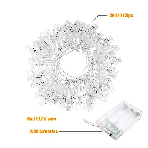 40 LED Foto Clip Stringa Illuminazione, Adurei 6m/19.7ft Batteria Alimentato LEDs Foto Clips Fairy Decorative Lights Appendere Foto Christmas Carte per Indoor/Outdoor Partito (Bianca Calda)