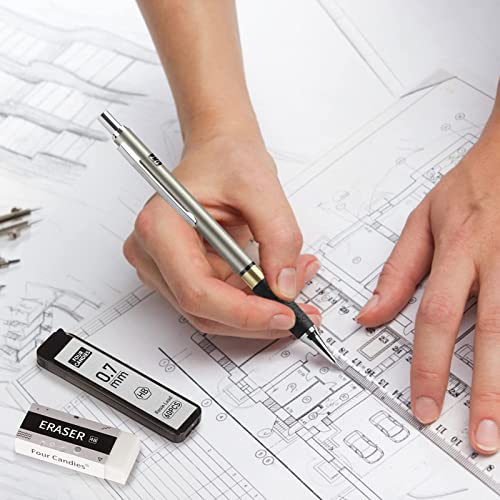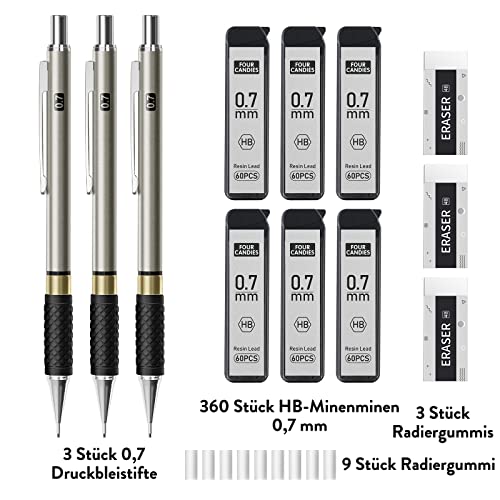 Four Candies Set di 3 portamine in metallo, 0,7 mm, matite meccaniche con 360 mine HB, 3 gomme e astuccio, portamine per scrivere e disegnare per ingegneri