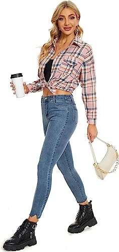 Fourindo Camicia a Quadri da Donna Top in Cotone da Donna con Bottoni a Manica Lunga da Donna Camicie da Ragazzo Oversize Capispalla con Tasca Camicetta Casuale
