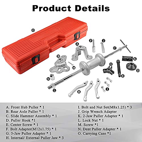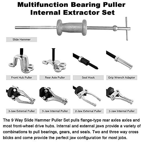 Set di estrattori multifunzione: set di estrattori con diversi accessori e configurazioni. Per rimuovere il mozzo dei cuscinetti della ruota, l'asse posteriore, il cambio, la guarnizione e molto altro ancora. Progettato per il lavoro senza danneggiare i componenti. Lo strumento giusto per il lavoro di rimozione, niente più urti e danni alle parti dell'auto. Questo prodotto è stato accuratamente progettato per offrire la durata desiderata.