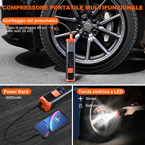 【Batteria Integrata & Ingresso DC】: Batteria al litio integrata da 6000 mAh con pompa ad aria portatile, quindi ha più del 40% in più di capacità della batteria rispetto ad altri prodotti (può gonfiare completamente 3 pneumatici da zero pressione dell'aria). Quando la carica della batteria è finita, si può collegare la pompa all'accendisigari con il cavo d'ingresso DC 12V prolungato da 3,5m per l'utilizzo, non dover mai preoccuparsi di mancanza di energia elettrica.