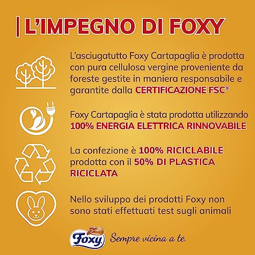 Foxy Cartapaglia | Asciugatutto 2 rotoli | 2 veli elevato spessore Vortici Super-Assorbenti | FSC |100% Energia elettrica rinoabile | Confezione 100% riciclabile prodotta con plastica riciclata