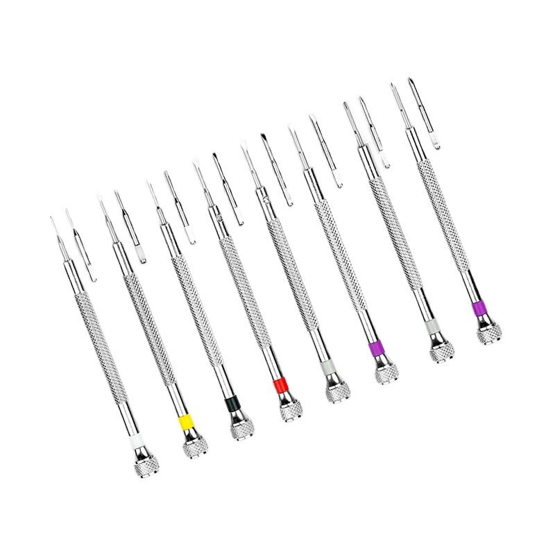 Strumenti professionali: I cacciaviti di precisione sono cacciaviti a lama piatta standard con testa girevole. Sono strumenti professionali per la riparazione di orologi e sono facili da usare, il che li rende ideali per gli orologiai. Materiale di alta qualità: L'ago del mini cacciavite è realizzato in acciaio 45 di alta qualità. Il manico è in acciaio e plastica. Non è facile da ossidare, non arrugginisce, è resistente e ha una lunga durata. Più dimensioni: Le lancette del set di cacciaviti dell'orologio sono disponibili in cinque misure, 0,6 mm , 0,8 mm, 1 mm, 1,2 mm, 1,4 mm e 1,6 mm, Croce 1,4 mm e 1,6 mm;