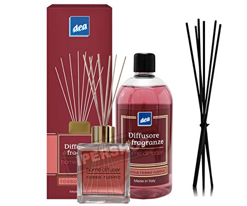 Dea set fragranza rosso rubino: diffusore di fragranza bastoncini 200 ml + ricarica 500 ml + ricambio 10 bastoncini neri